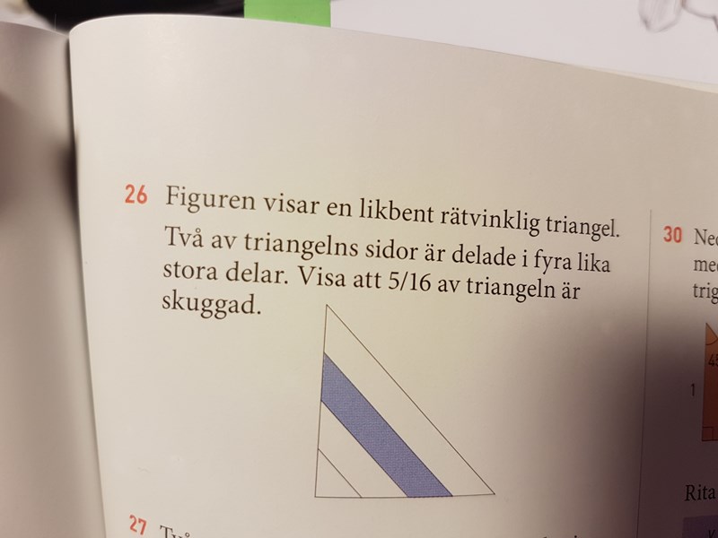 "Drag tre vertikala och tre horisontella linjer i triangeln så att den delas in i 16 lika stora småtrianglar. Eftersom 5 småtrianglar är skuggade måste 5/16 av figuren vara skuggad."