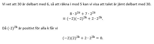 Tomten skrev:När jag gör det kommer jag till samma fram t o m den fjärde raden. Sedan för slumpen mig en lite annan väg. Låt A vara uttrycket i din fjärde rad. A= (21+4)52k+1 -(5+4)32k+1 -4*22k+1 =21*52k+1 -32k+1 +4(52k+1 -3 2k+1 -22k+1 ) =21*52k+1 -32k+1 +30m =21*5*52k -5*3*32k +30m=15(7*52k -32k )+30m =B+30m.Det räcker nu att visa att parentesen i uttrycket B är jämn. Men det är lätt ty första termen innehåller bara faktorerna 7 och 5 alltså inte faktorn 2 och är därför udda. Andra termen innehåller bara faktorer 3 och är således udda. Differensen mellan två udda tal är alltid jämn, varför alltihop är delbart med 30. Bev