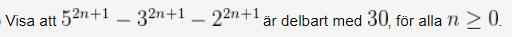 Den första termen är ju med i uppgiften, så den vet vi är delbar med 30. Den andra termen är delbar med 5, vet dock inte hur jag ska bevisa det på enklast sätt? Räcker väl inte att bara att räkna ut med två-tre olika n och sedan att se att dom talen går att räkna i mod 5?