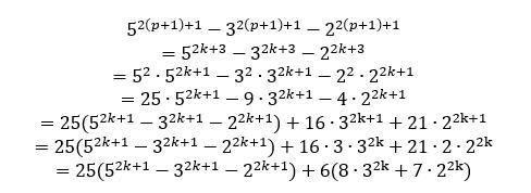 Jag ser att utskriften blev lite konstig med bl a femman som du markerat. Försöker igen: ....... A= (21+4)52k+1 -(5+4)32k+1 -4*22k+1 =21*52k+1 -5*32k+1 +4(52k+1 -32k+1 -22k+1 ) =(sista parentesen =30m enl induktionsantagandet)= 5*7*3*52k -5* 3*32k +30m =15(7*52k-32k)+30m ...... och därefter samma resonemang som ovan.