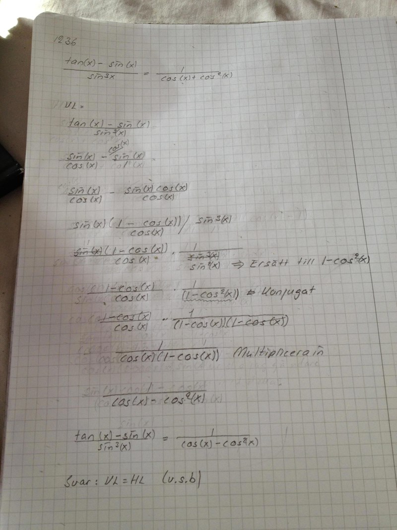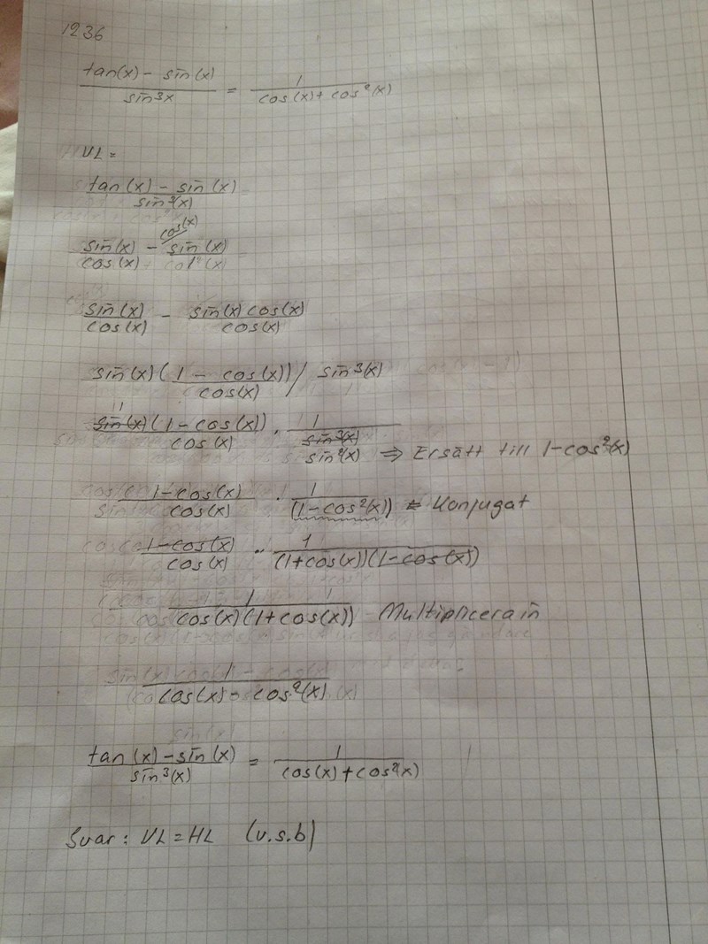 tanx-sinxsin3x=1cosx+cos2x. \displaystyle \frac{\tan x - \sin x}{\sin^3 x} = \frac{1}{\cos x + \cos^2 x} .