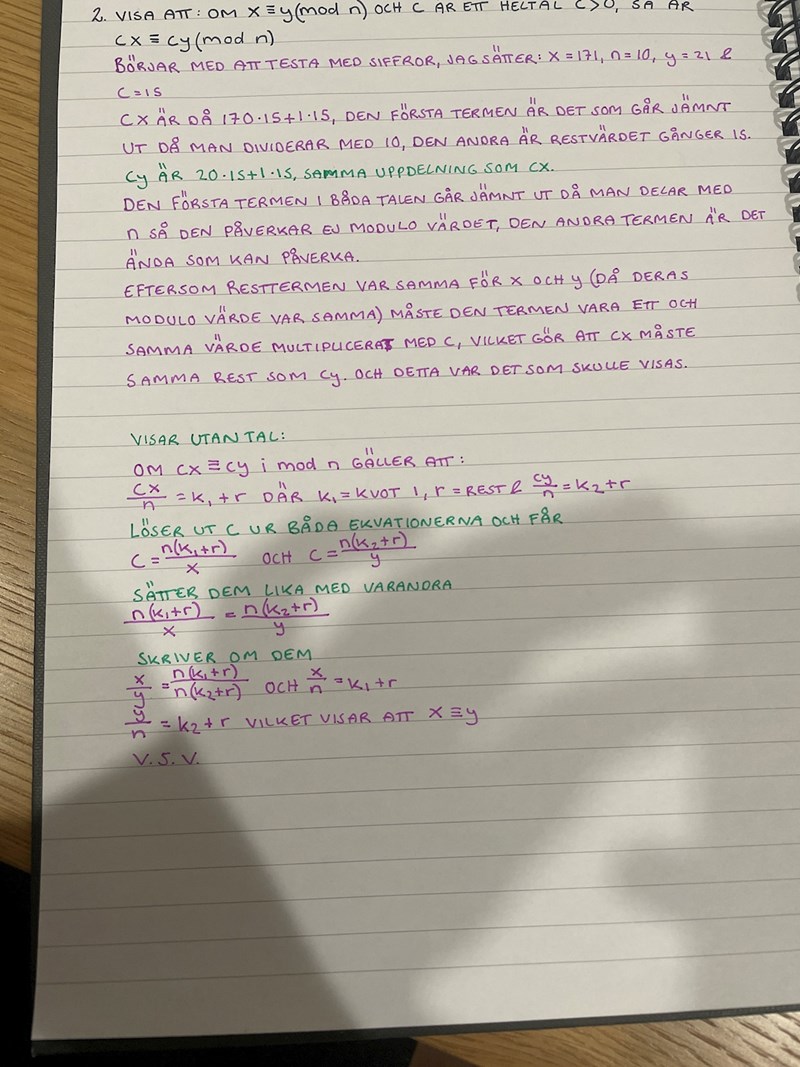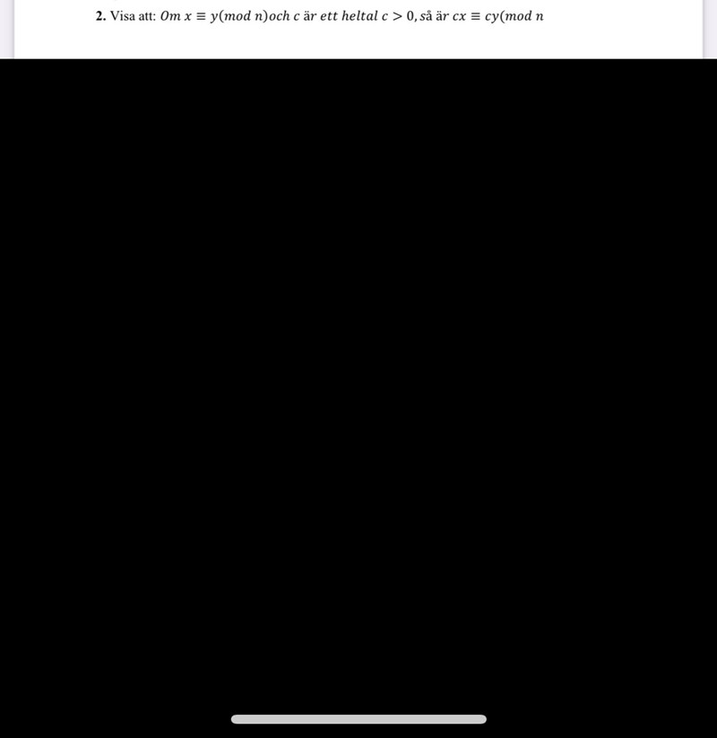 den första termen i båda talen går jämnt ut då man delar med n så den påverkar ej modulo värdet; den andra termen är det ända som kan påverka. Eftersom resttermen var samma för x och y (då deras modulo värde var samma) måste den termen vara ett och samma värde multiplicerat med c, vilket gör att cx måste ge samma rest som cy. Och detta var det som skulle visas.