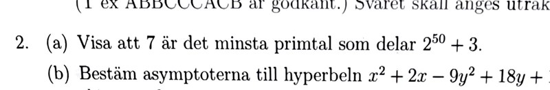 Varför skall man visa att 2^50 +3 inte är jämnt delbart med 2 och 5? om frågan gäller att visa att 7 är det minsta primtal som delar 2^50+3