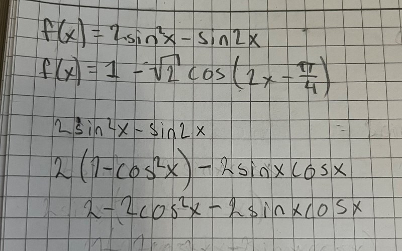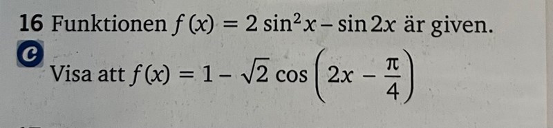 - En av termerna som du på så sätt fått innehåller . Skriv om denna term m.h.a. dubbla vinkelns formel för cosinus.