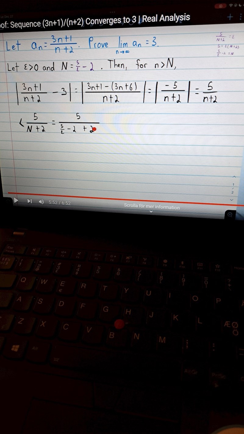 I videon byter han ut lilla n mot stora N vilket jag inte begriper varför. Sen på slutet säger han att hela uttrycket är lika med epsilon. Hur är det lika? Han sätter även 5/(N+2)=Epsilon innan. Man får väl inte göra så om man bevisa att uttrycket är mindre än epsilon för något epsilon >0?