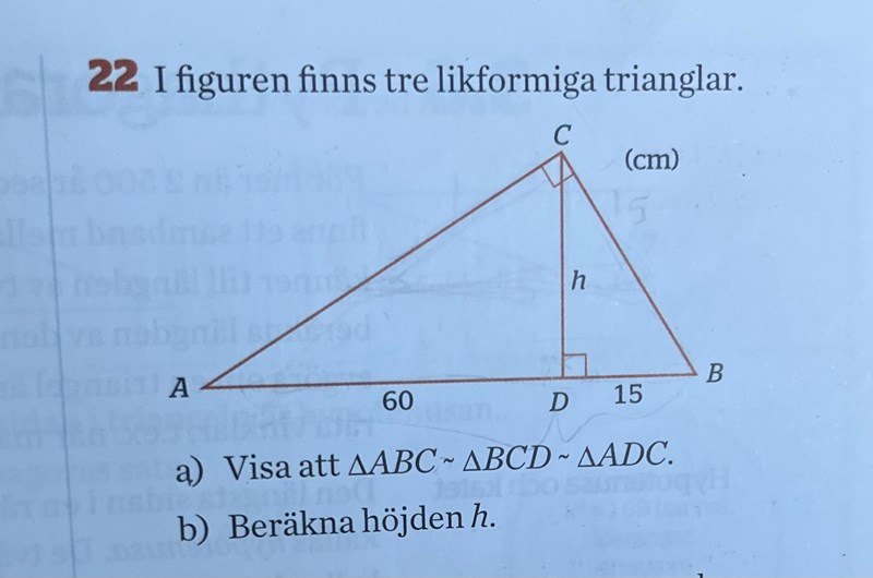 Alltså är din första uppgift att visa att alla tre trianglar i bilden är likformiga. Tror du att du kommer vidare härifrån?