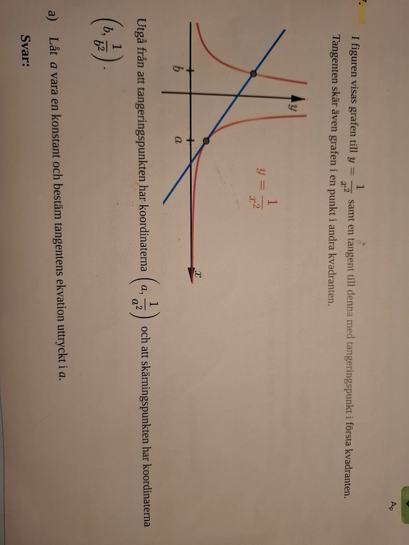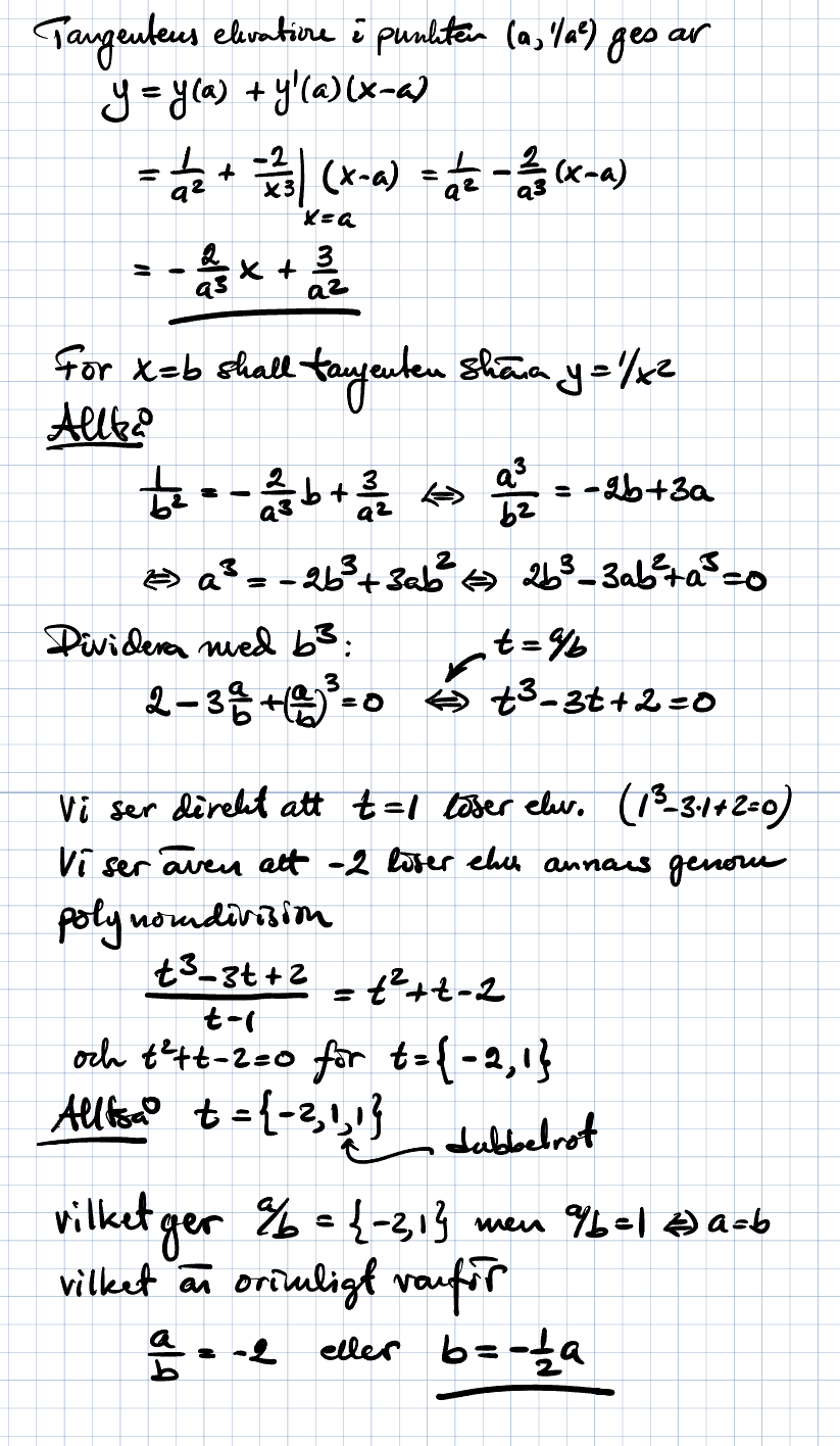 Tangentens ekvation är, y = -2x/a^3 + 3/a^2. Jag vet att man borde kunna hitta punkten b relativt enkelt med digitala verktyg, och eventuellt polynomdivision. Dock för denna uppgift ska man kunna lösa den utan några digitala verktyg. Jag kan ställa upp det till skärningen mellan funktionerna med. 1/x^2 = -2x/a^3 + 3/a^2. Vilket kan vidare utvecklas till, 0 = -2x^3/a^3 + 3x^2/a^2 - a. Då hat man en tredjegradsfunktion. Som också borde kunna omskrivas till. 0=-2x^3 + 3ax^(2) - a^3