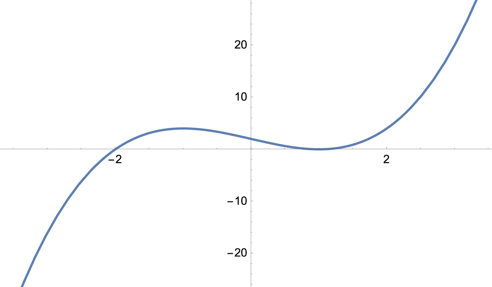 Du skulle kunna plotta t^3-3t+2 och ana dig till var den skär x-axeln och sedan verifiera detta genom att sätta in -2 och 1. Du kommer att se att den har dubbelt nollställe för 1.