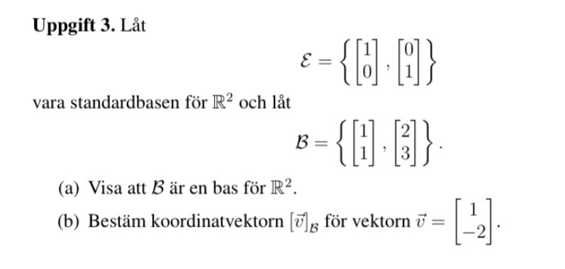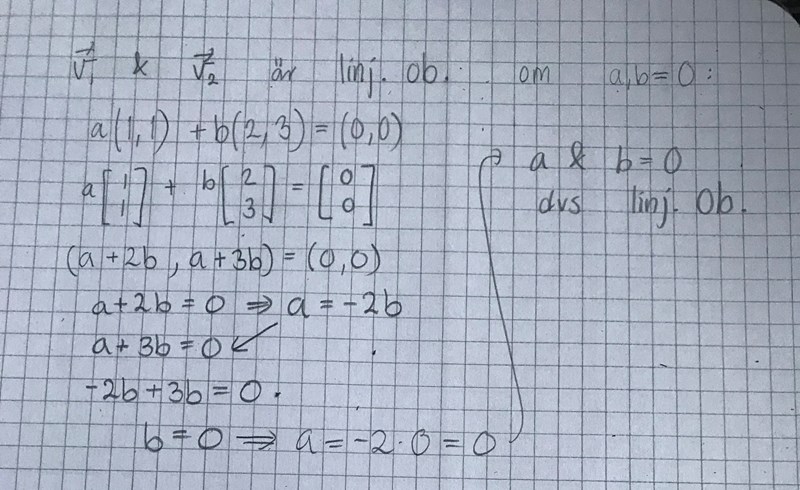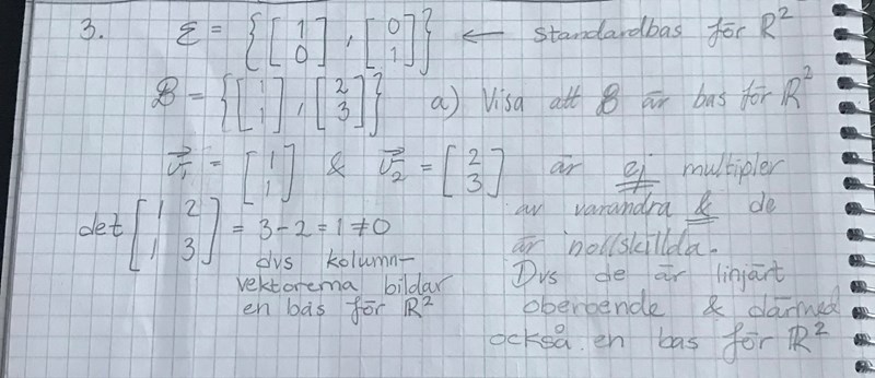 pepparkvarn skrev:Det du skrivit på första bilden (exempelvis att determinanten är nollskild) räcker gott och väl, särskilt med den motivering du skrivit i bild ett. Vektorerna är tvådimensionella och oberoende, då spänner de upp en bas för . :)
