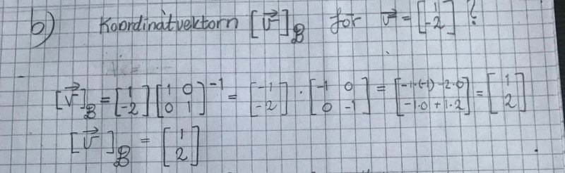 Här har det blivit lite knas. Om ska vara skriven i basen B, ska det innebära att [v]E = B*[v]B. Gör såhär istället: Du ska hitta en vektor (a,b) som vid multiplikation med B ger vektorn v: