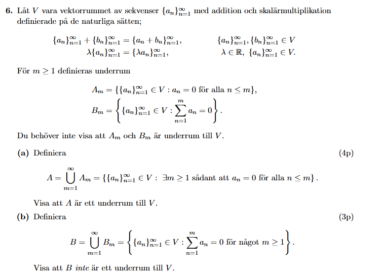 Jag tänker att för att visa att inte är ett underrum till så måste vi visa att inte är sluten under någon av operationerna på . Mer specifikt tänker jag på addition. Jag resonerar på följande vis: