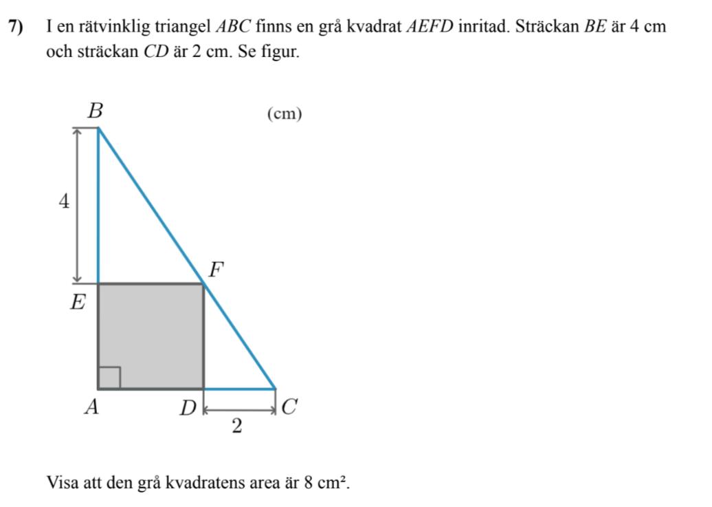 Visa att den grå kvadratens area är 8 cm2. Se figur och fråga nedan.