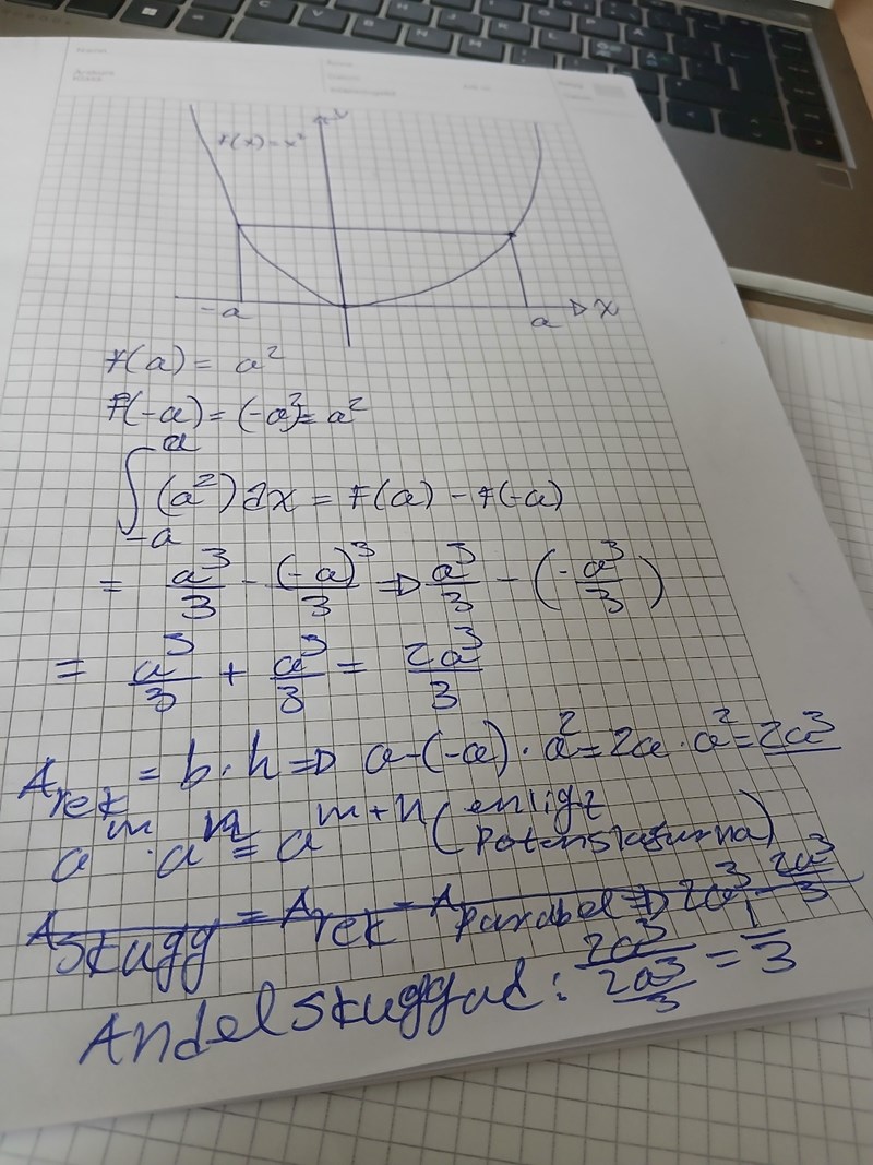 Sen finns det såklart förenklingar att göra, t.ex. att se att det pga symmetri räcker att beräkna areorna och andelarna av områdena i första kvadranten, dvs det räcker att integrera från x = 0 till x = a.