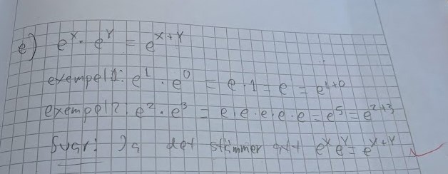 Hej jag hade nyss en test där vi fick uppgiften visa att e^x*e^y=e^x+y