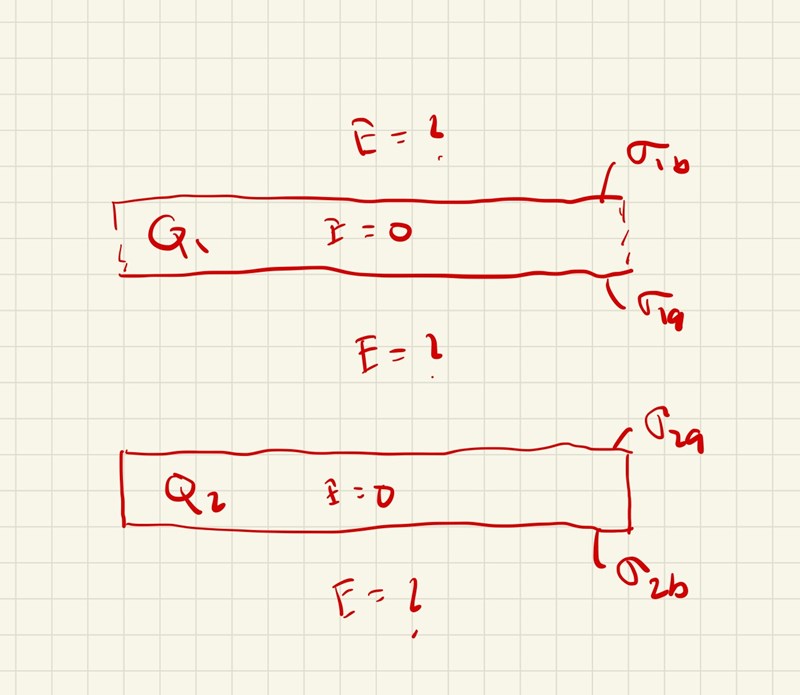 Om du har en metallplatta (ledande platta) så är fältet inne i plattan noll. Du kan ha en ytladdningstäthet på undersidan och en annan på översidan. Så i princip kan du få fyra parallella ytor med laddning.