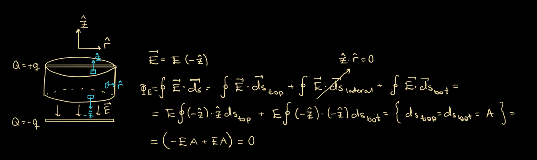 Hej, till situationen nedan, två parallella plattor där övre har laddning +q och nedre -q. Vill ta fram det elektriska fältet mellan. Gör en Gauss yta som täcker ena plattan och använder mig av Gauss lag på integralform. Det elektriska fältet pekar i riktning, och normalen till de övre Gausslocket har motsatt riktning på normalen riktning. Vi får därför -EA för det övre locket. På samma sätt för det undre locket, här dock är elektriska fältet och normalen i samma riktning, vi får +EA. Summan blir alltså 0, vilket det inte bör. Vad missar jag?