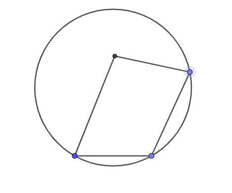 - Övriga fall: Sätt ihop två sidor till en längre, så att det bildas en triangel. En triangel kan alltid inskrivas i en cirkel. Ta tag i föreningspunkten mellan de båda hopsatta sidorna och flytta den utåt, bort från cirkelns centrum. De tre ursprungliga hörnen ligger fortfarande på en cirkel, men cirkeln krymper. Till slut ligger det fjärde hörnet på cirkelns periferi, och vi har bevisat att det går.