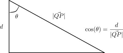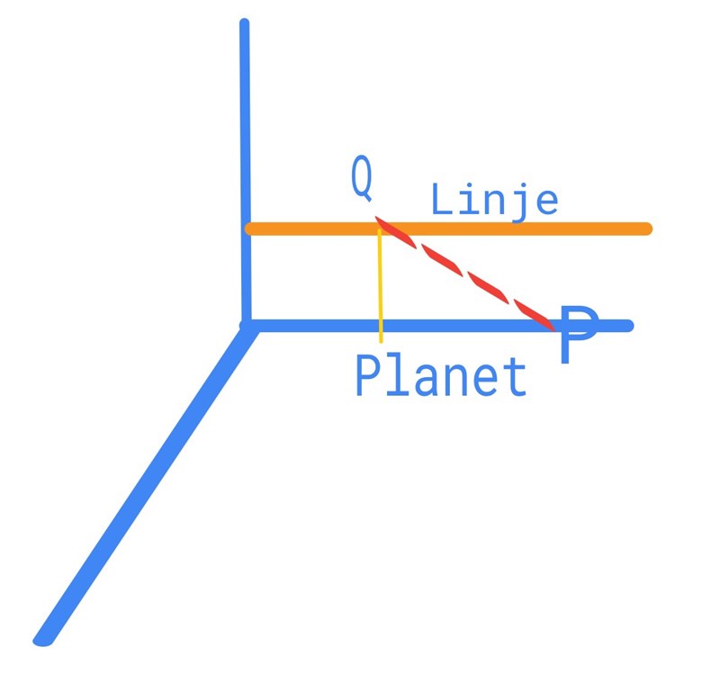 I denna ritning representerar den nedre horisontella linjen planeten, och linjen ovanför representerar ”parallella linjen”. Punkten P är en punkt på planeten, och punkten Q är en punkt på linjen. Normalvektorn skulle vara en vektor som pekar uppåt och som är vinkelrät mot planeten, den ritade jag med ett gult streck. Vektorn mellan P och Q ritade jag med ett rött streckad linje.