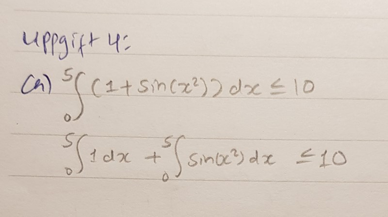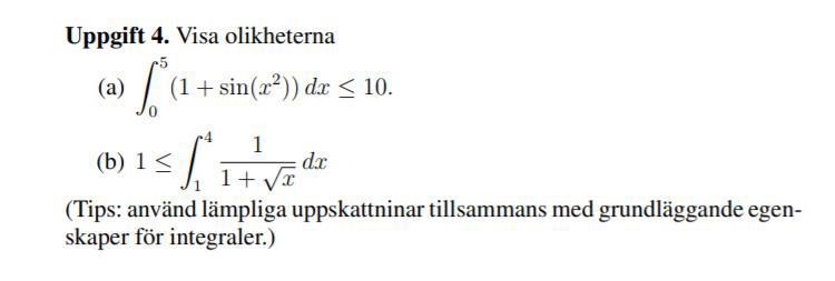 Nox_M skrev:i fråga (a) sin av ett nummer är alltid mindre än 1 men vet inte hur informationen kan hjälpa mig att uppskatta om integralen är mindre än ett viss nummer