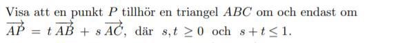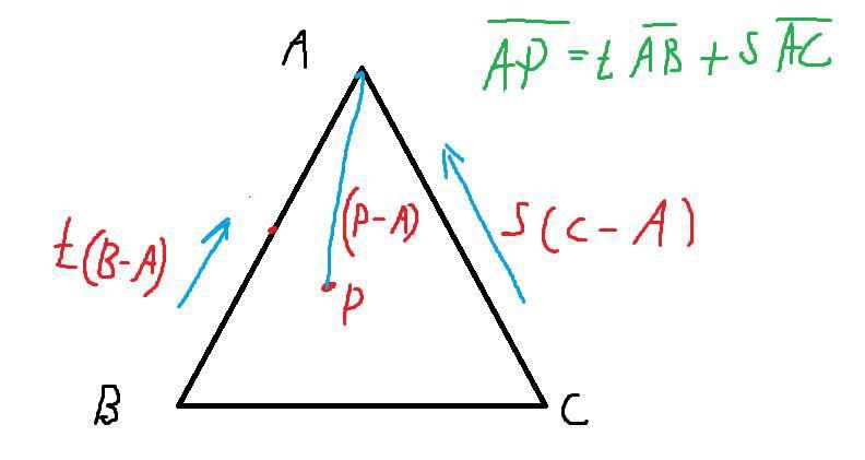 AP representerar vektorn som hör till en godtycklig punkt i triangeln. AP uttrycks med vektorerna AB och AC. Då en specifik AP väljs får s och t specifika värden, tex 0.25 och 0.3. Varken s eller t kan vara större än 1 eftersom då rör vi oss utanför triangeln. S eller t kan däremot vara 0 för då rör man sig längs ett av triangelns kateter.