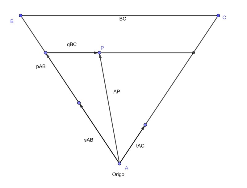 Låt pAB representera en godtycklig punkt på sträckan AB. AB anger att vi är på AB kateten medan p anger exakt var. Vandrar man sen från den här punken med riktningen BC så kan vi hamna i punkten P. Skillnaden är att istället för att använda oss av AB och AC som tidigare så gör vi det genom att använda riktningarna AB och BC istället. Samma begränsningar gäller för p och q som gäller för s och t, dvs 0<p,q<1. Det är viktigt här att poängtera att p och s är inte samma tal. Geometrin hade inte gått ihop om så var fallet.