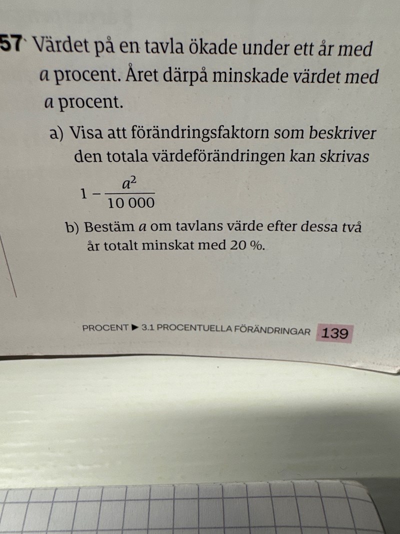 KlmJan skrev:Saken är den att jag itne riktigt vet hur jag ska skriva a% som en förändringsfaktor när det ökar med a%. a% i bråkform är ju a/100. men man vill ju ha dit en etta så att det liksom blir