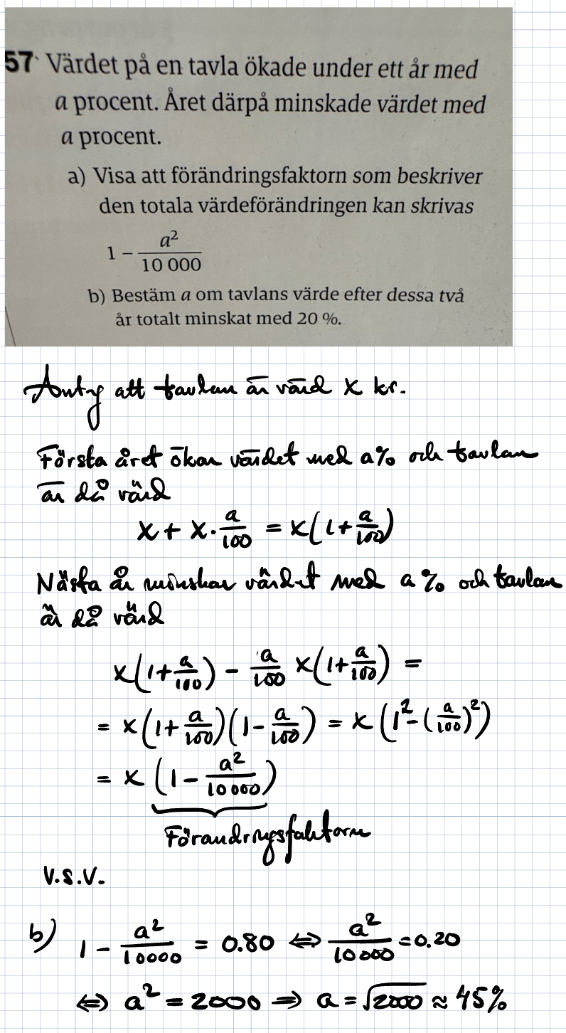 Om tavlan ursprungligen var värd V kr. Kan du teckna ett uttryck för värdet efter 1 år med hjälp av din förändringsfaktor och V? Hur ser det ut efter 2 år?