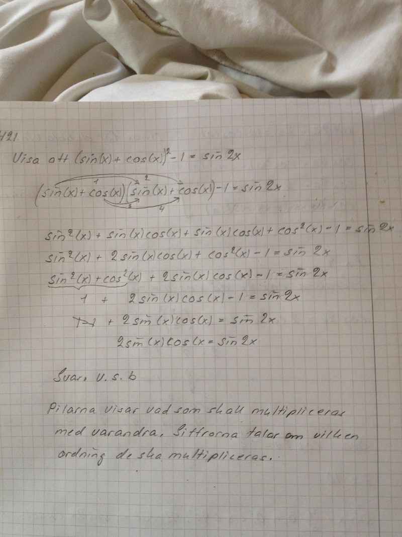 Jag håller med tomast. Att utgå från V.L. och sedan använda identiteten 2sin(x)cos(x)=sin(2x) 2sin(x)cos(x)=sin(2x) . Då får man direkt sin(2x)=sin(2x) sin(2x)=sin(2x) vilket är uppenbart. :)