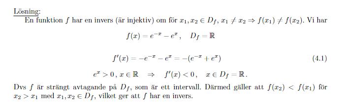 Vi ser att derivatan är strikt negativ, vilket innebär att är strikt avtagande på hela sin definitionsmängd. Detta betyder att mappar exakt ett element ur sin definitionsmängd till exakt ett element ur sin målmängd, vilket inebär att: