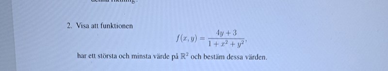 f är definierad och kontinuerlig överallt. Den kan vidare anta såväl positiva som negativa värden, säg f(x,y) =u>0 någonstans och f(x,y) =v<0 någonstans. Det medför att den har minst ett nollställe i R2 . Vidare går den mot 0 när (x,y) går mot oändl. Då finns ett stort värde a sådant att för x2+y2 > a2 medför att f(x,y) <= u och att f(x,y)>= v Det visar att den har både största och minsta värde. Att bestämma dessa är ingen rolig uppgift, så den överlåter jag till hugade.