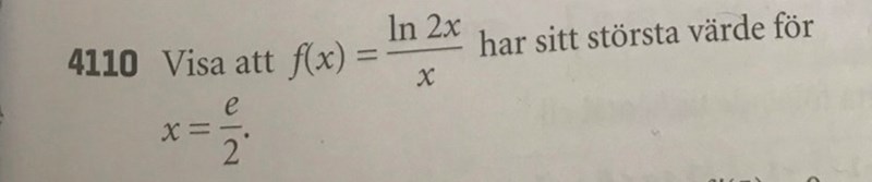 Nästan, men du har endast visat att vi har en extrempunkt då x=e/2. Nu måste du vissa att detta faktiskt är ett maximum.
