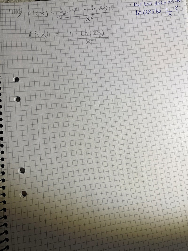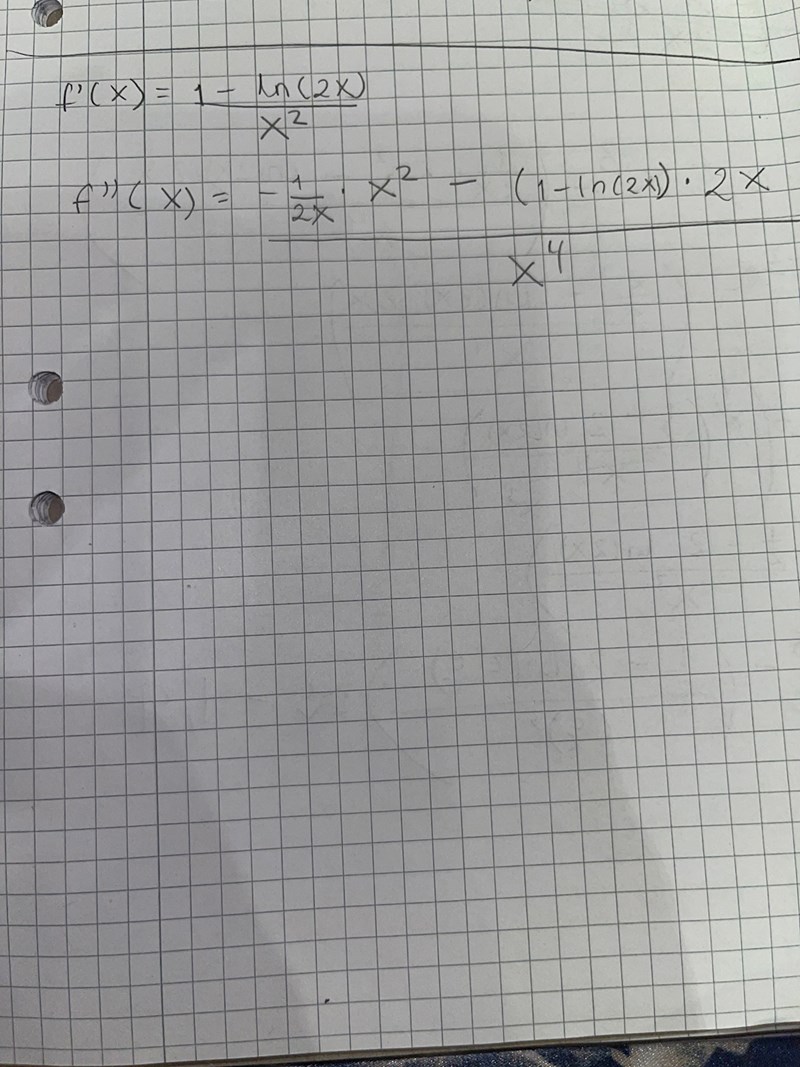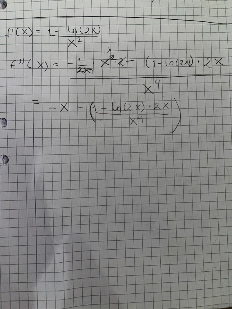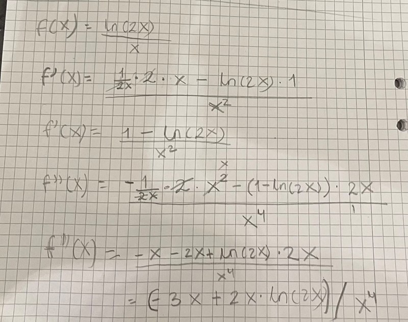 Hela täljaren blir -x + -2x(1-ln(2x)) = x(-1-2(1-ln(2x)) = x(-1-2+2ln(2x)) = x(2ln(2x) - 3)
