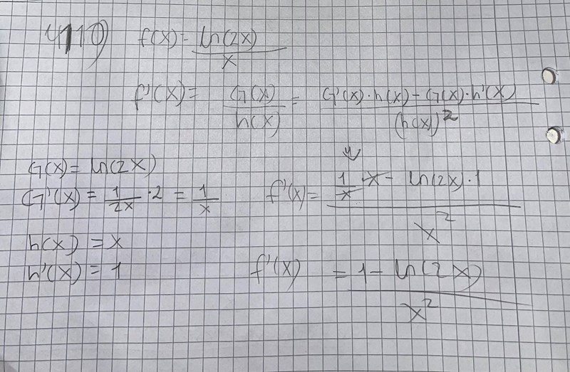 h'(x)=f'(g(x)) * g'(x) = 1/g(x) * 2 = 1/(2x) * 2