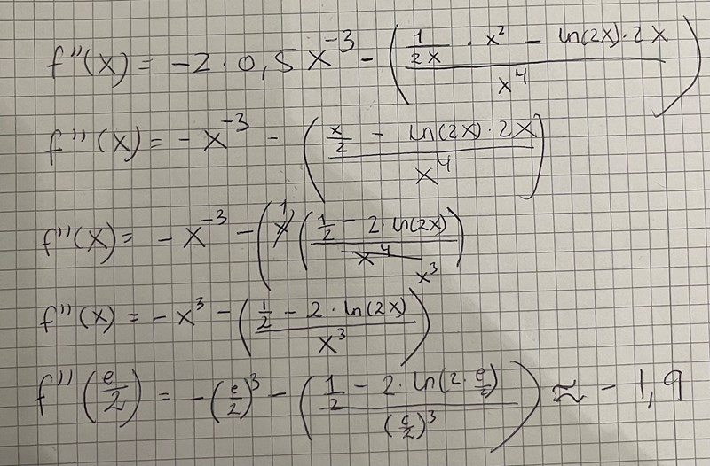Här har jag använt kvotregeln och därefter andra derivata och då fick jag att x=e/2 ger en negativ andra derivat alltså en maxpunkt . Är det rätt?