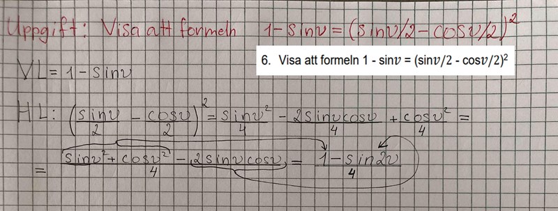 Uppgift: Visa att formeln 1-sinV=(sinv/2-cosV/2)^2