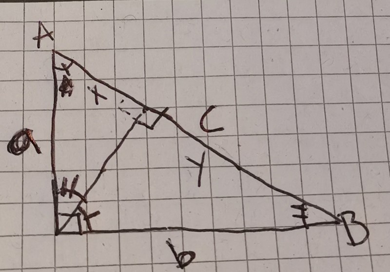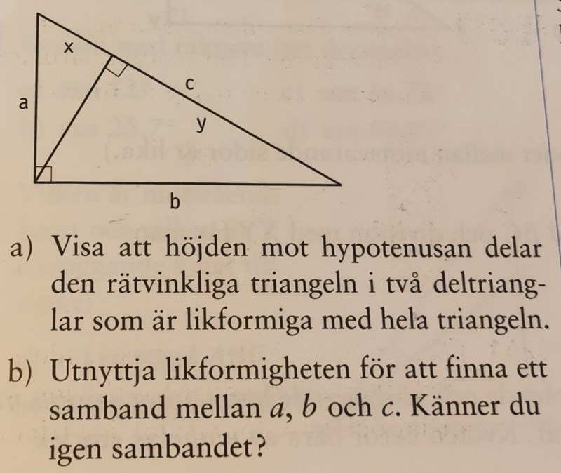 Börja med att kalla de båda vinklarna som inte är räta i den stora triangeln för någonting, t ex x och y, och fortsätt att markera alla vinklar som är lika i de båda andra trianglarna. Du kan behöva använda dig av vinkelsumman i en triangel för att få fram dem.