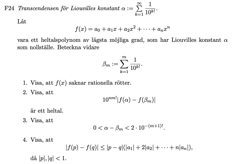 Eftersom f(x) är av lägsta möjliga grad är Liouvilles konstant den enda roten. Liouv. konstant är irrationell. Är inte säker på att det räcker som svar. Tror ni man behöver bevisa det? Det gäller alltså fråga 1.