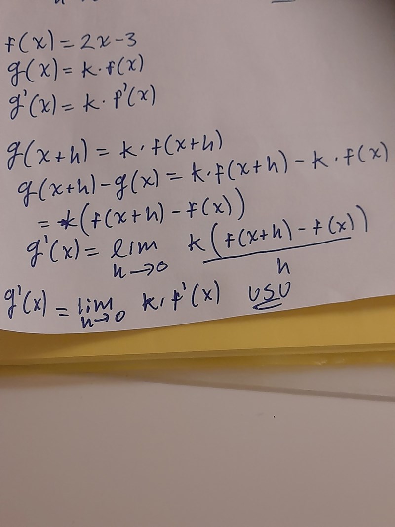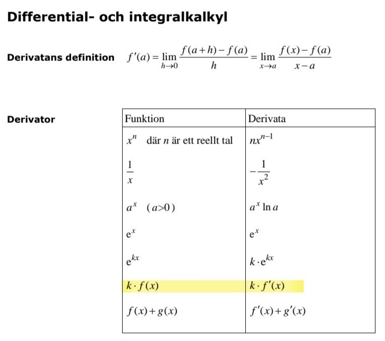 - Det betyder att g'(x) = k*f'(x), vilket skulle visas.