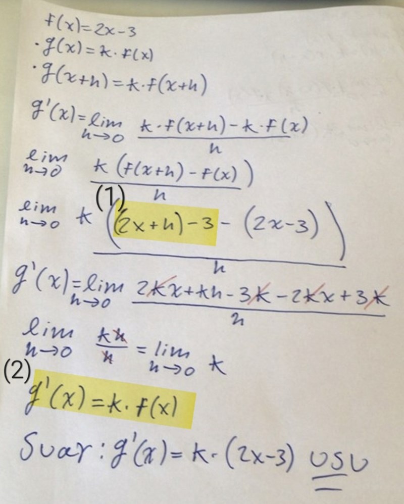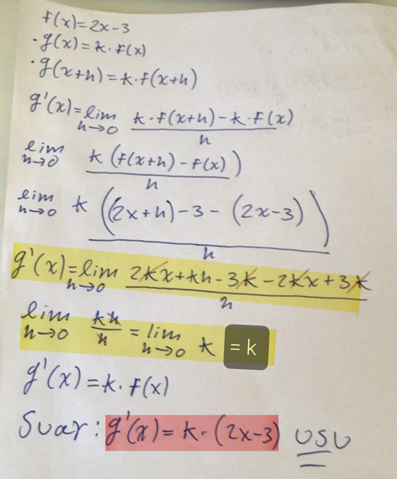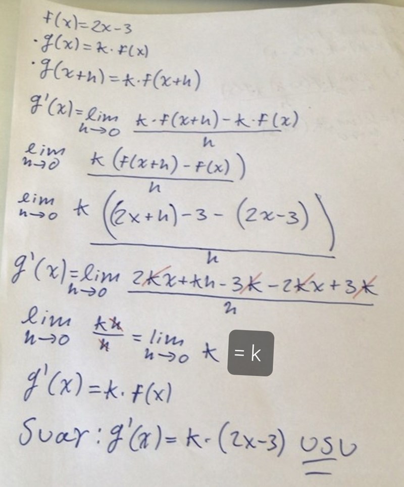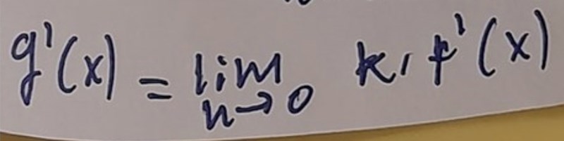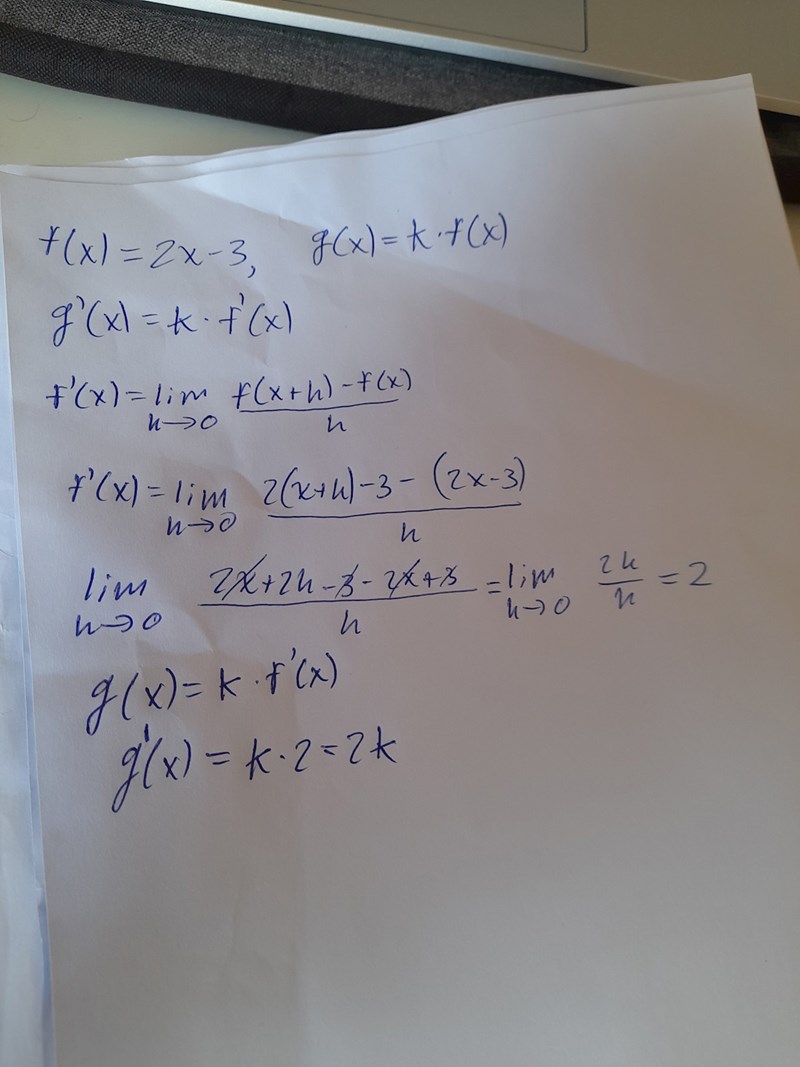 Och om du visar att f'(x) = 2 så räcker det med att du visar att g'(x) = k*2.