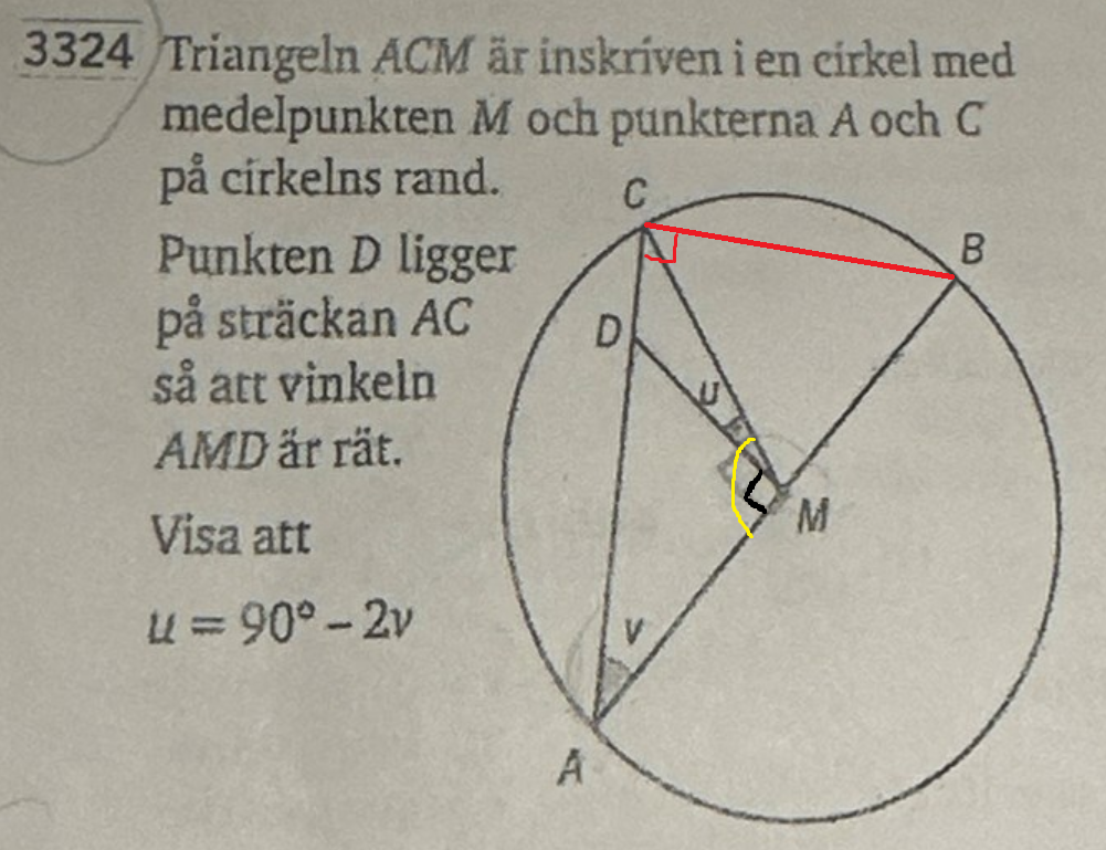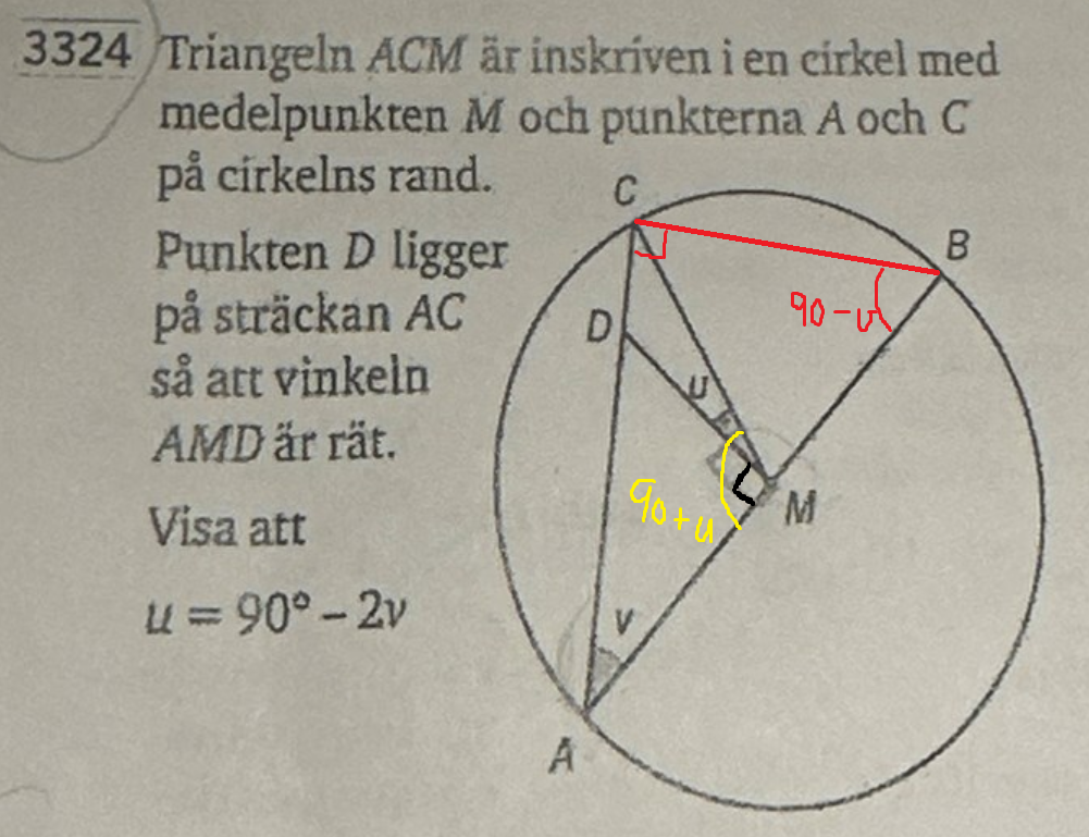 Eftersom uppgiften ger oss att AMD är rät, så blir den gula vinkeln AMC=90+u.