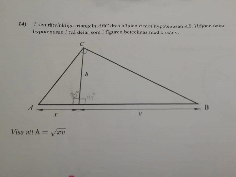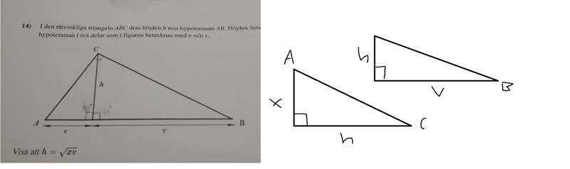 EDIT: men om man inser att de rätvinkliga trianglarna är likformiga så blir det en kortare väg till svaret.