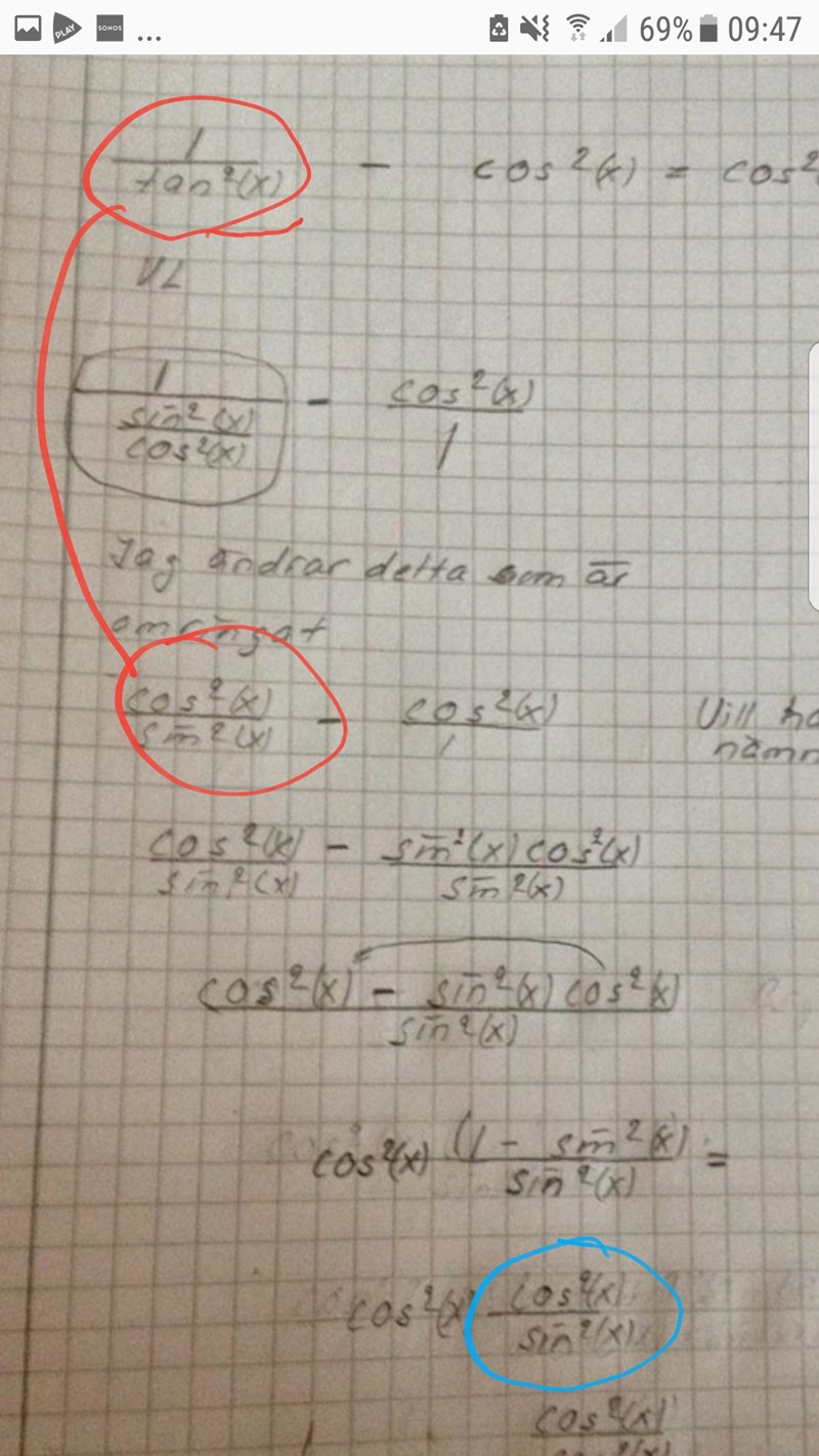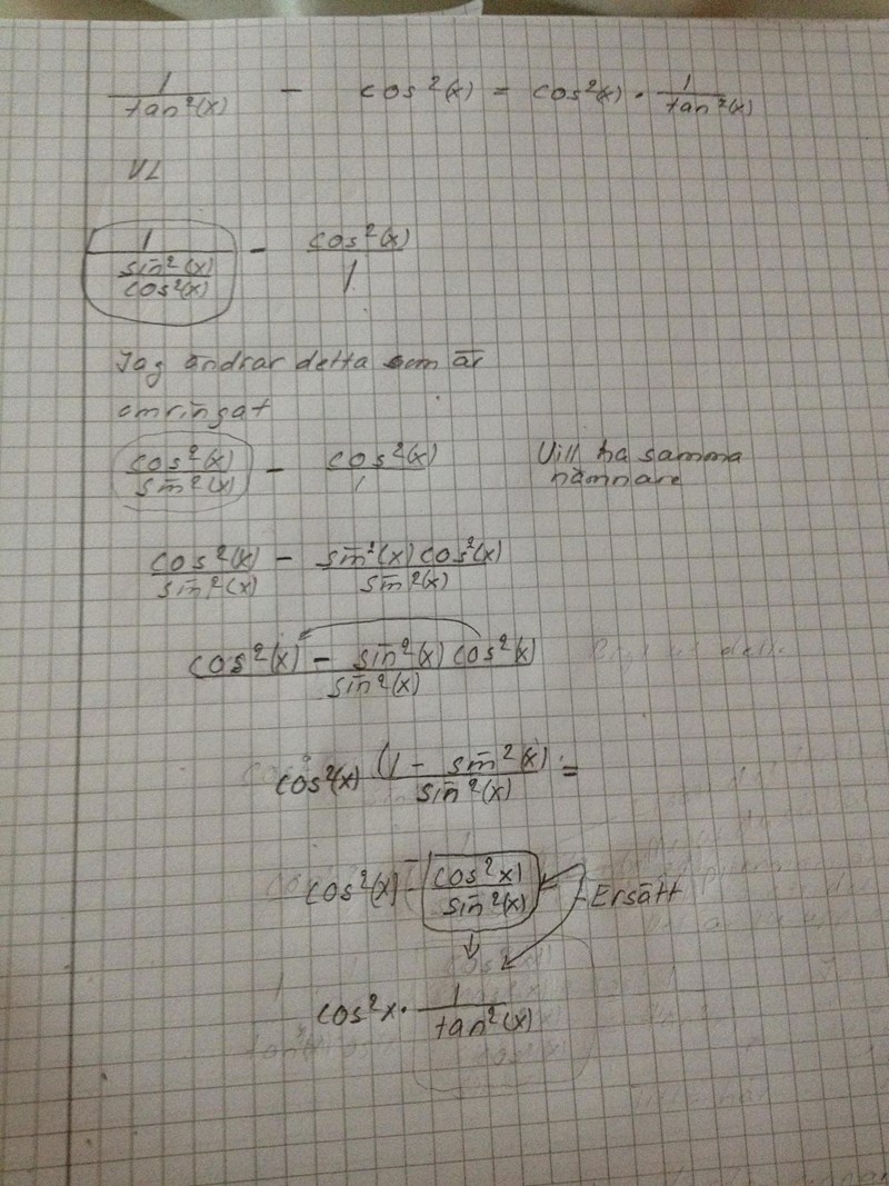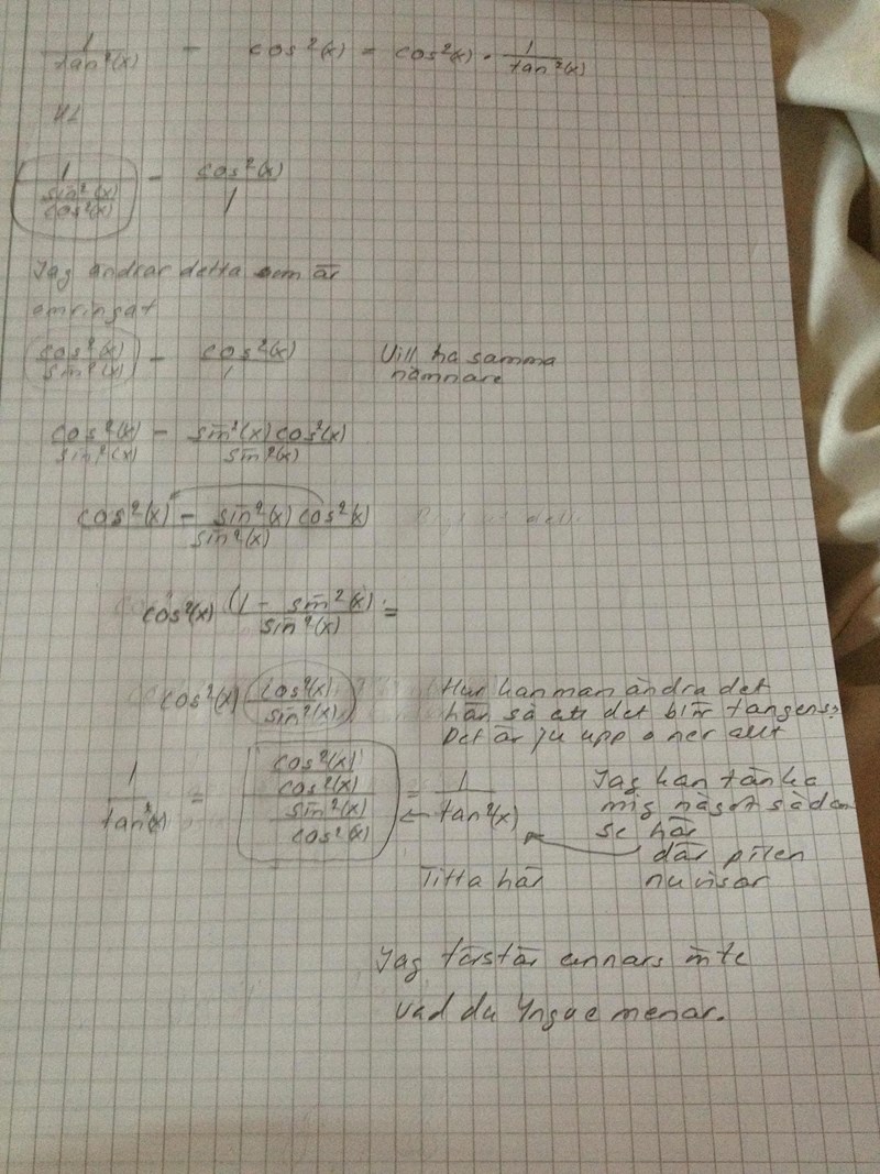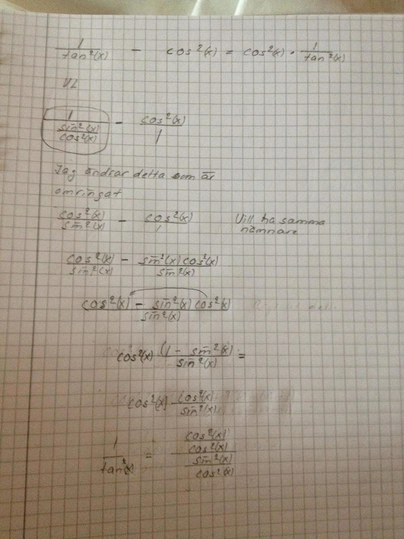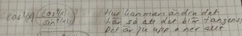 Päivi skrev :Det som stör är att cos^2(x) står i täljaren och sin^2 (x) i nämnaren. Där är jag frågetecken.