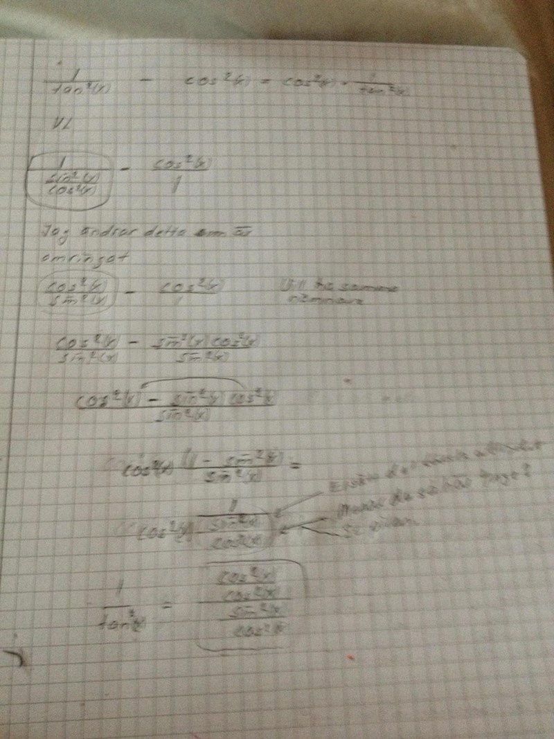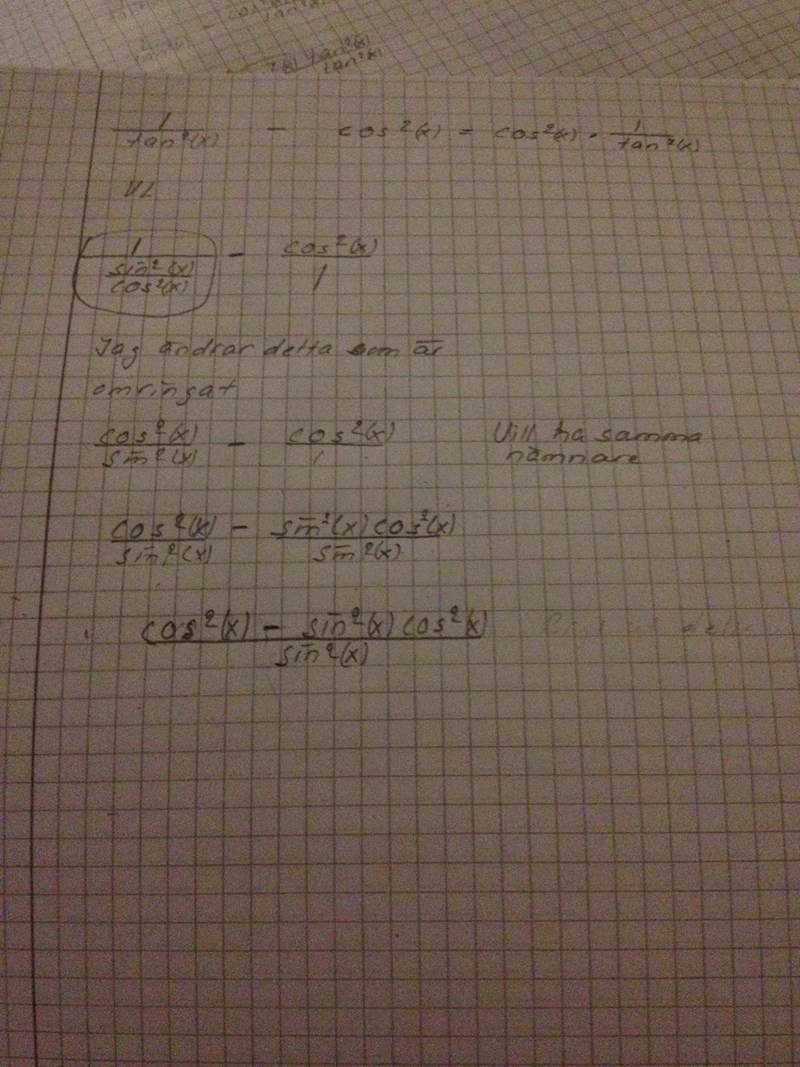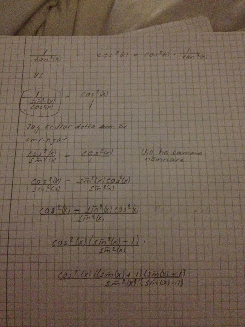 Det som stör är att cos^2(x) står i täljaren och sin^2 (x) i nämnaren. Där är jag frågetecken.