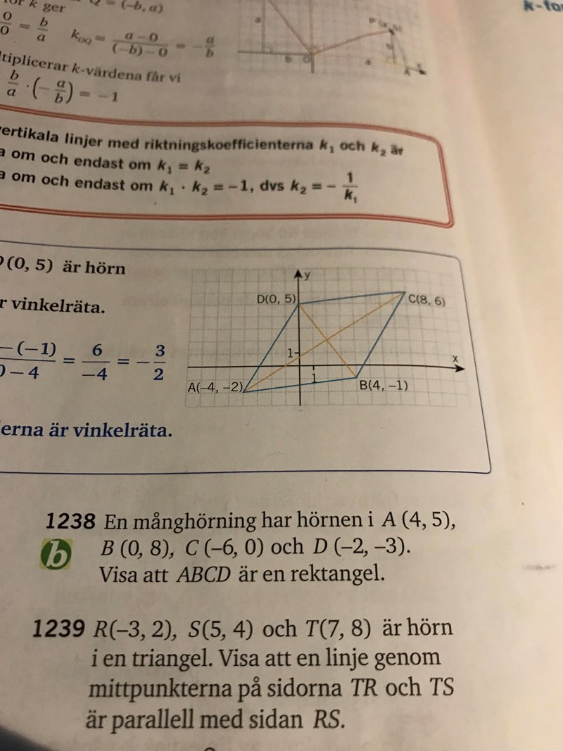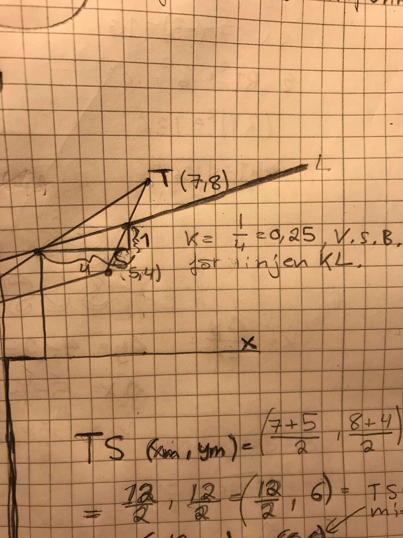 Om du har 2 punkter så kan du dra en linje genom dem. KL går genom de 2 mittpunkterna på TS och RT. Om du hittar koordinaterna för dessa 2 punkter så kan du räkna ut ditt k-värde. Antingen med ett ekvationssystem eller med någon formel som kanske kan heta 2-punktsformeln.