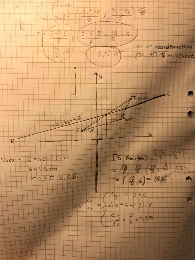 Jag har dock svårt att förstå hur jag ska kunna få fram k-värdet på min linje KL, vilken är den som är en linje genom mittpunkterna på sidorna TR och TS. Detta har jag försökt lösa genom att sätta in k = 0,25 för denna nya linje KL och få ut m-värdet, vilket då blir m = 4,5. Men jag har väl inte visat att k-värdet för linjen KL är k= 0,25. Hur visar jag det algebraiskt? Grafiskt har jag gjort en linje genom mittpunkterna på sidorna TR och TS. Men den behöver inte heller ha rätt k-värde.