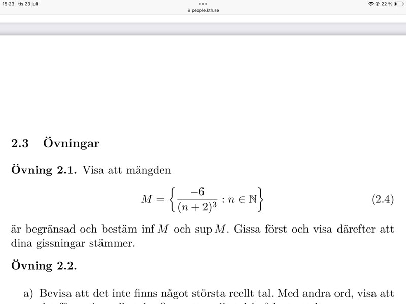 Följden är växande (vilket måste visas) så det första värdet är ett minimum till M.