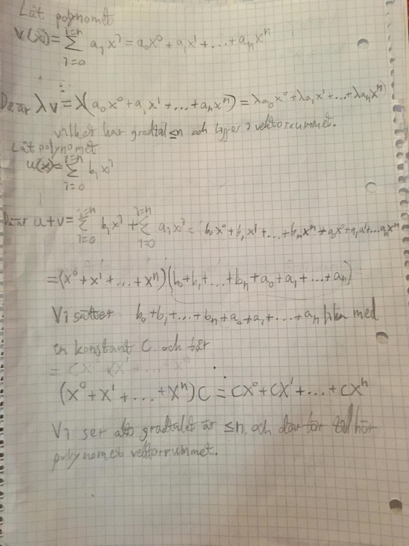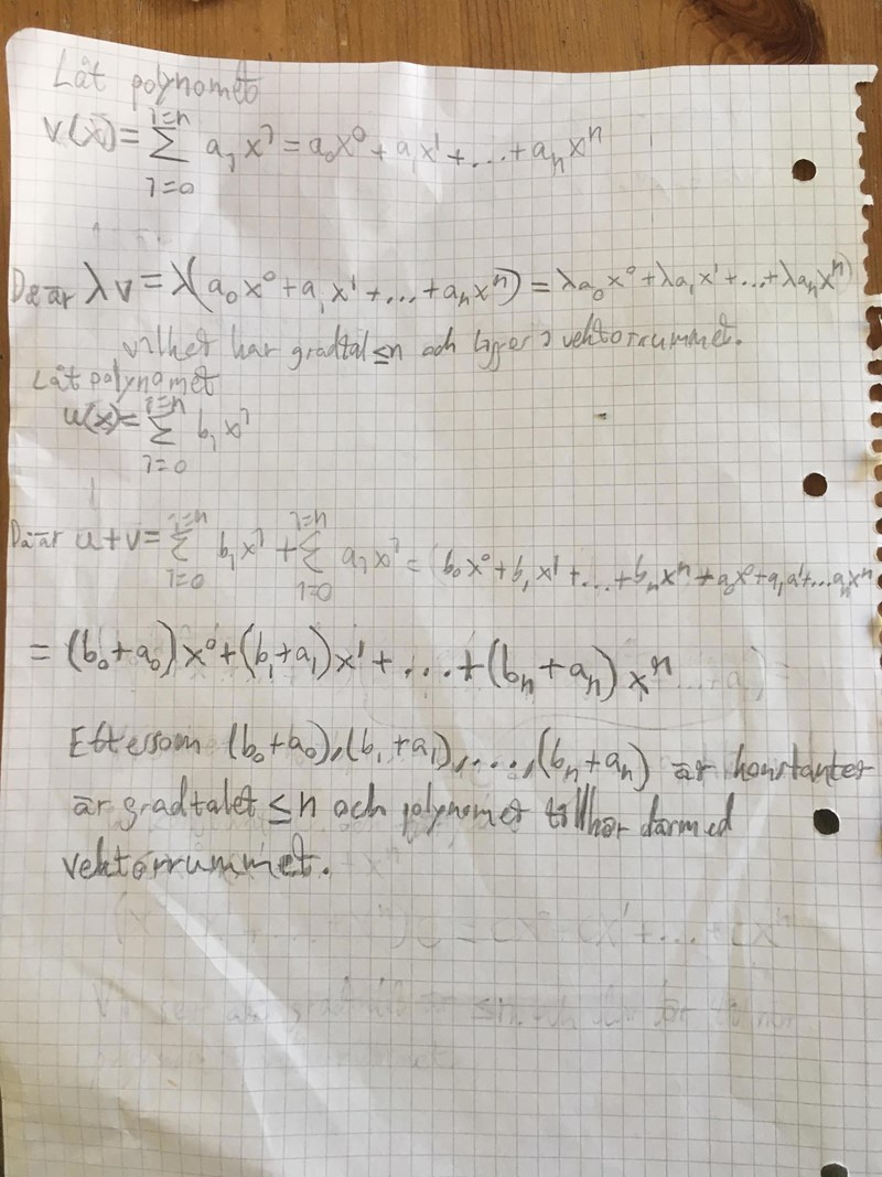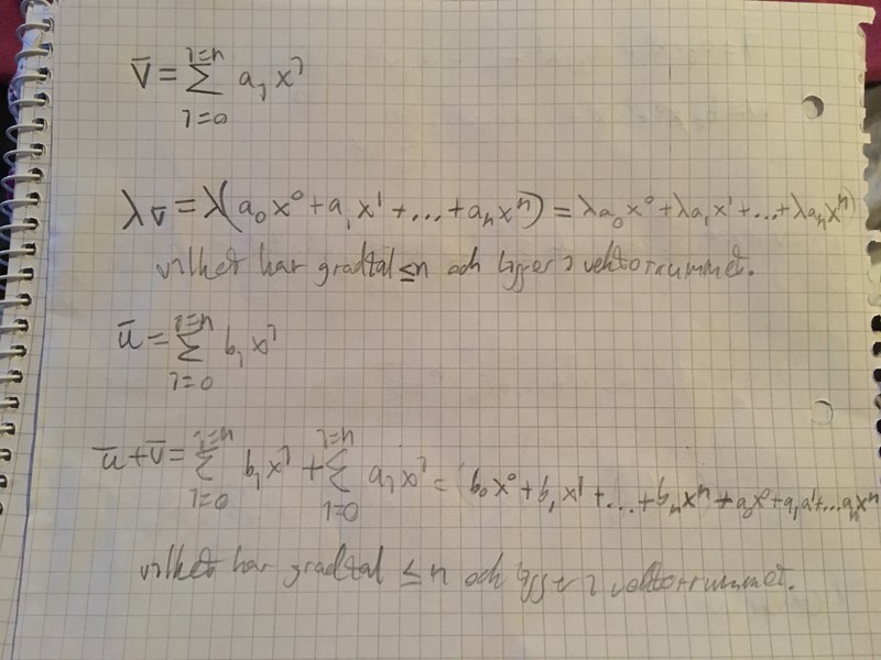 Om vi väljer två godtyckliga polynom p och q i V av grad max n så kommer enligt den första räkneregeln grad(q+p) = eller mindre än n och enligt den andra räkneregeln grad(lamda*p)= eller mindre än n, lambda olikt 0. Alltså är V sluten under skalärmultiplikation och addition.