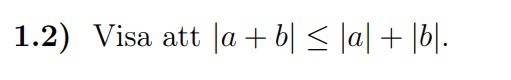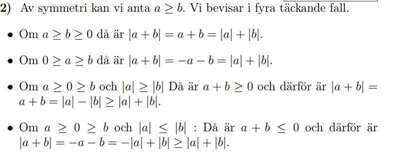 Således har vi att |a + b|2 (|a| + |b|)2. Vilket ger det sökta resultatet om vi drar roten ur på båda sidor. Roten ur är en strikt växande funktion, så olikheten bevaras när vi drar roten ur.