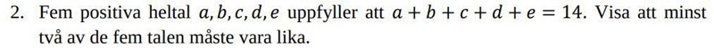 Visa att minst två av de fem talen måste vara lika om 5 positiva heltal har summan 14