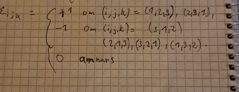 Jag tror inte jag förstår riktigt varför det saknas minustecken vid det här bytet. Om vi har eijk=-ejik eller om vi har eijk=-ekji. Sen har jag svårt att hänga med på ditt byte varför det ser ut som det gör och varför du gör på det sättet. Jag tänkte att man följer det här nedan. Så egentligen borde du ha minus framför ekij eftersom eijk=-ekij enligt nedan och eijk=-ejik om man ska behandla udda och jämn permutationer.